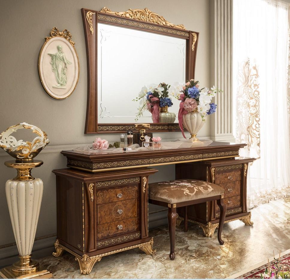 S toaletním stolem se zrcadlem Komoda Konzola Ložnice Vana Kompletní se každé ráno nebo večer stanou chvíle péče o sebe ještě příjemnějšími. Toaletní stolek nabízí dostatek prostoru pro vaše kosmetické potřeby a stolička zajišťuje komfort během používání. S nastavitelným zrcadlem se snadno upravíte nebo líčíte pod optimálním osvětlením. Tento exkluzivní kus nábytku bude skvělým doplňkem vaší ložnice nebo koupelny, díky čemuž získáte elegantní a funkcionalistický designový prvek do vašeho interiéru.