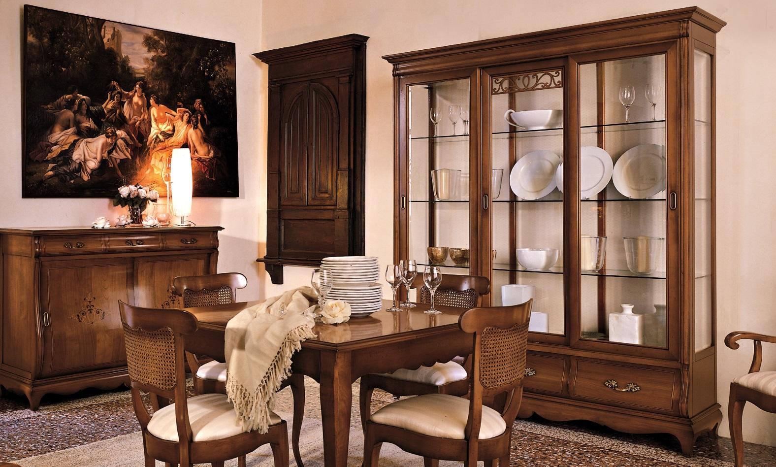 Sada nábytku: stůl, 4x židle, vitrína, komoda, jídelní sestava 7 dílů, jídelna.