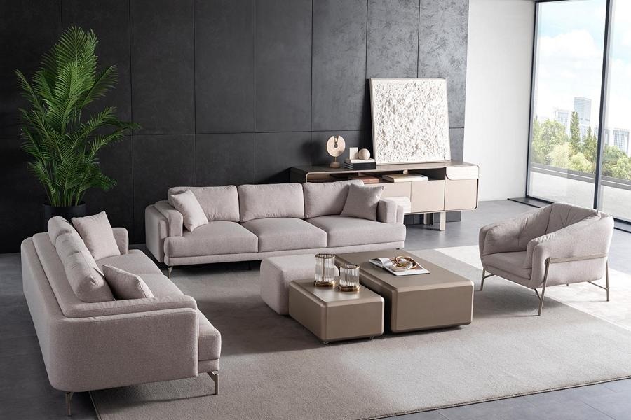 Sada nábytku do obývacího pokoje v béžové látce s moderními pohovkami a křeslem