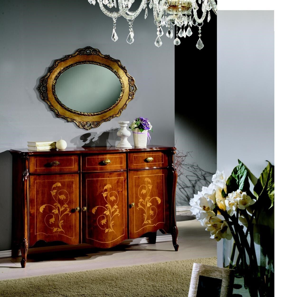 Sada komody a zrcadla z luxusního dřeva je skvělým doplňkem pro váš obývací pokoj, ložnici nebo chodbu. Styl Baroko dodá vašemu interiéru nádech elegance a nadčasovosti, zatímco italský původ nábytku zaručuje špičkovou artesanální kvalitu a detailní zpracování. Komoda poskytuje dostatek úložného prostoru a zrcadlo zase dodává prostoru světlost a pocit prostornosti. Tato sada je dokonalou kombinací tradičního designu a luxusního vzhledu pro ty, kdo očekávají jen to nejlepší.