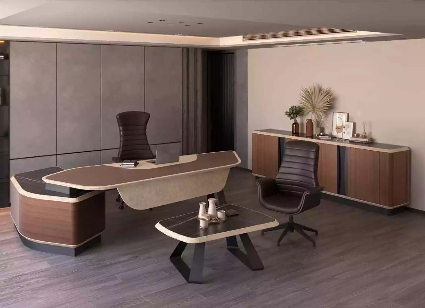 Tento moderní pracovní prostor je kompletním luxusním nábytkem pro vaši domácí kancelář nebo pracovnu. Součástí tohoto setu je **rohový psací stůl**, který je ideální pro efektivní využití rohového prostoru a nabízí dostatek pracovní plochy. K tomu patří i **konferenční stůl** a **skříňka**, která poskytuje dostatek úložného prostoru pro dokumenty a další potřeby. Vyrobena je z masivního dřeva, což zajišťuje vysokou kvalitu a trvanlivost nábytku.