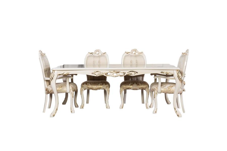 Jídelní set 9 kusů Luxus nábytek Stůl 6x židle Komoda Zrcadlo Nový nábytek je dokonalým doplňkem každé jídelny či obývacího pokoje. Tento elegantní set obsahuje jídelní stůl o rozměrech cca 210 x 110 x 81 cm, 6 kusů židlí, komodu a zrcadlo. Všechny kusy jsou vyrobeny z kvalitního dřeva a skla, což zajišťuje jejich dlouhou životnost a odolnost. Díky modernímu designu a neutrální barvě je tento nábytek vhodný pro různé interiéry a styly, zároveň dodá vašemu domovu luxusní vzhled.