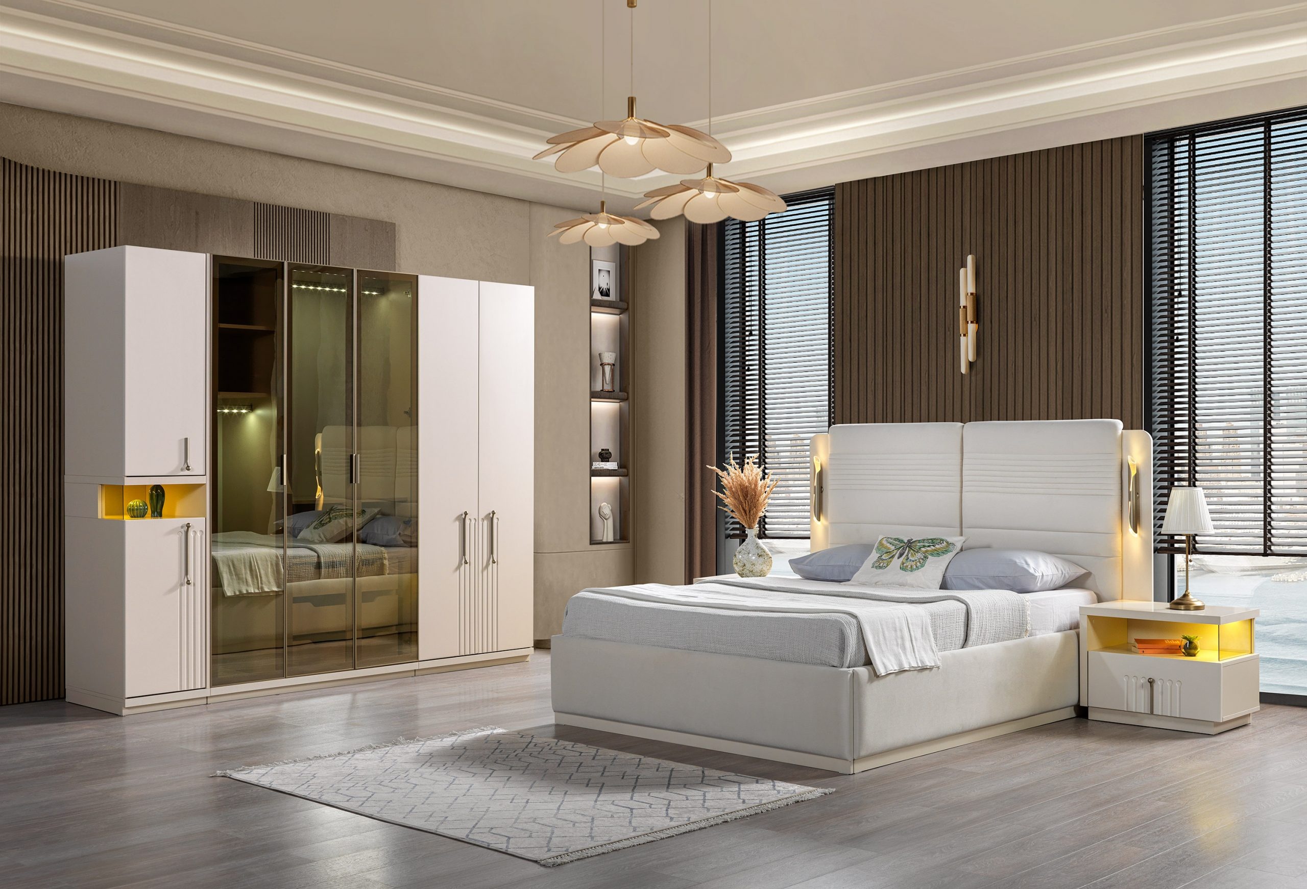 Kompletní ložnicový set postel, skříň a noční stolky v elegantní béžové barvě představuje spojení nadčasového designu a prvotřídní kvality. Tento exkluzivní čtyřkusový set je navržen s ohledem na požadavky moderního životního stylu, přičemž každý detail odráží preciznost a umění řemeslné výroby. Prostorná skříň poskytuje dostatek úložného prostoru, zatímco noční stolky s jemnými liniemi doplňují harmonii celého interiéru. Postel s luxusními povrchovými úpravami zajišťuje nejen komfort, ale i estetickou hodnotu. S tímto setem se vaše ložnice promění v oázu klidu a elegance, která dokonale vystihuje váš náročný vkus a vytříbený životní styl.