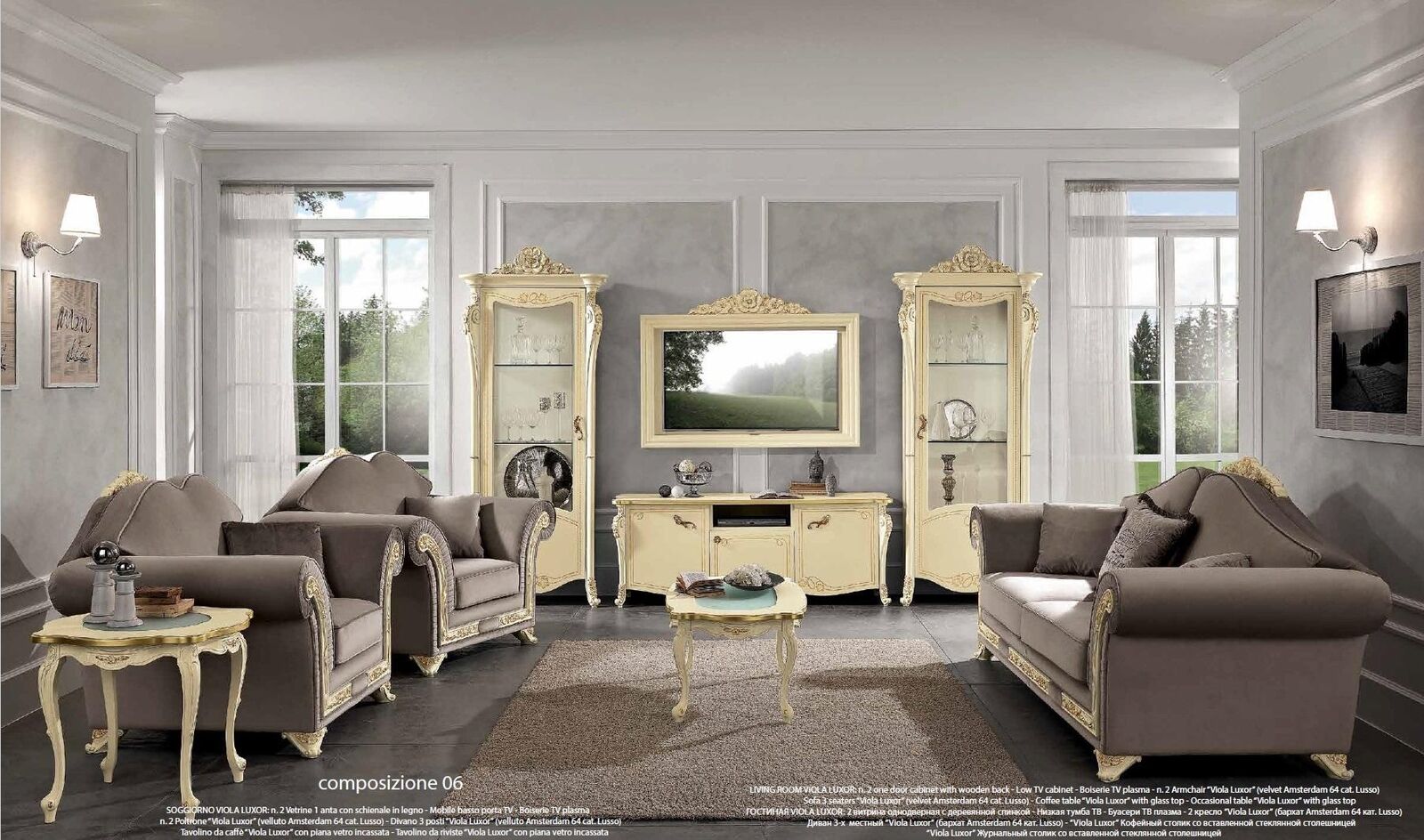Tento set dřevěného obývacího nábytku se skvěle hodí pro zařízení obývacího pokoje nebo salonku s důrazem na klasický elegance. Prozkoumejte možnosti aranžování jednotlivých prvků a vytvořte si svůj ideální interiér. Díky své univerzální barvě přizpůsobíte tento nábytek snadno existujícímu prostředí. Užijte si pohodlí a stylový vzhled s tímto luxusním setem italského designu.