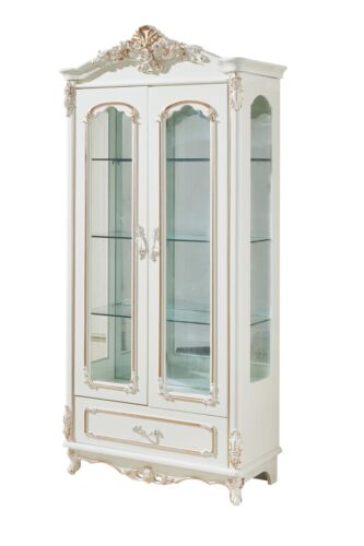 Vitrína Bílá Luxus Obývací Pokoj Nábytek Dřevo Sklo Design Elegantní Klasický je skvělým doplňkem pro váš obývací pokoj. S rozmermi přibližně 100 x 46 x 216 cm, tato nádherná vitrína poskytuje dostatek prostoru pro uložení a vystavení vašich oblíbených předmětů. S elegantní bílou barvou a kombinací dřeva a skla je nejen praktická, ale také designově přitažlivá. Materiál dřevo/sklo dodává vitríně luxusní vzhled a zároveň zajišťuje její trvanlivost a odolnost proti opotřebení. Vám i vašemu domovu přinese klasický a elegantní dotek.