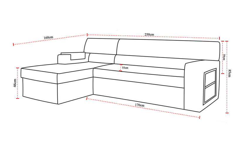 Rozkládací pohovka, sedací souprava, pohovka, čalouněný obývací pokoj. Sofa s funkcí spaní, pohovky je elegantním a praktickým doplňkem pro váš obývací pokoj. S možností rozložení na spaní nabízí pohodlné místo pro hosty nebo odpočinek po náročném dni. Díky dimensionálním možnostem 160 x 250 cm nebo 250 x 160 cm si můžete vybrat tu správnou velikost pro váš prostor. Vysoká výška 85 cm a široké sedací prostory 55 cm zajistí pohodlný relax pro všechny.