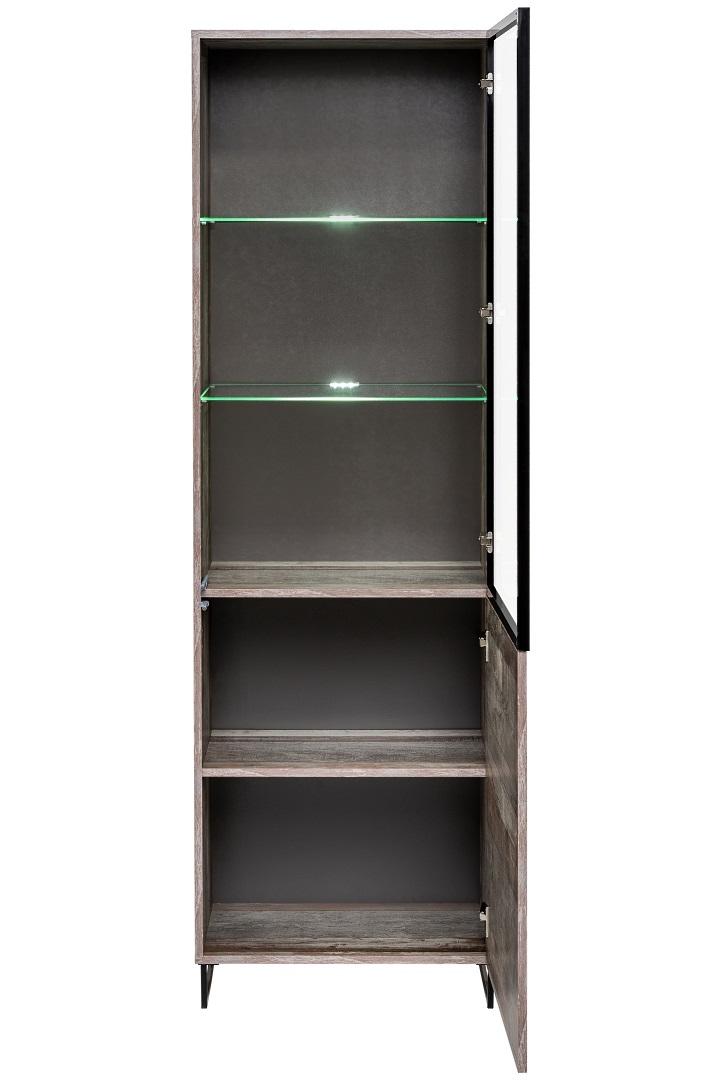 Vitrína Design Skříň Dřevo je moderní kousek nábytku, který zaujme svým elegantním designem a praktickou funkčností. S rozměry cca 60 x 40 x 194 cm poskytuje dostatek prostoru pro uložení a prezentaci vašich oblíbených předmětů a dekorací. Tato vitrína je vyrobena z kvalitního dřeva, což zajišťuje pevnost a odolnost. Díky šedé barvě se snadno hodí do různých interiérů a dodá vašemu prostoru moderní a stylový vzhled.