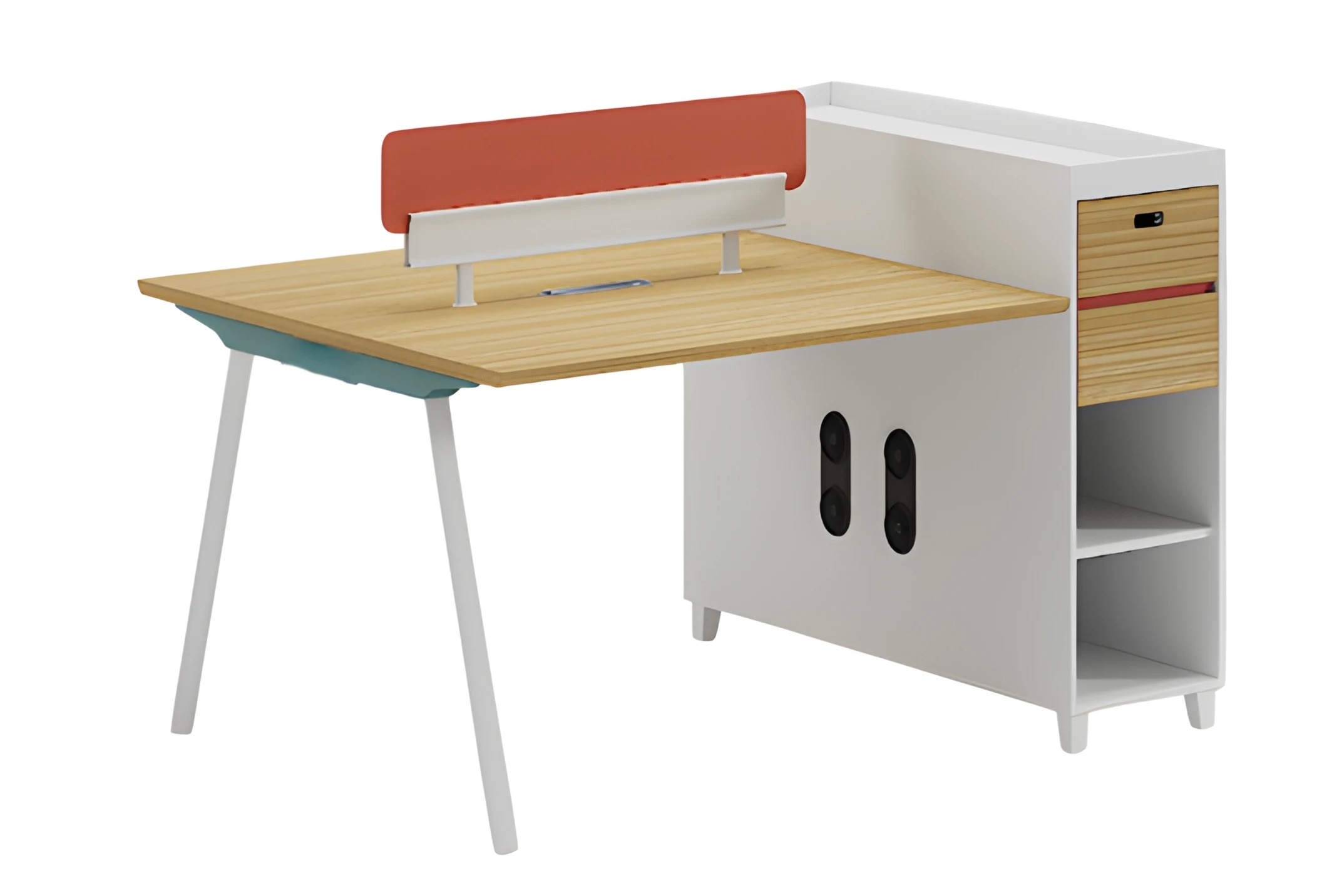 Dřevěný stůl s opěrkou, úložným prostorem a policemi, moderní design