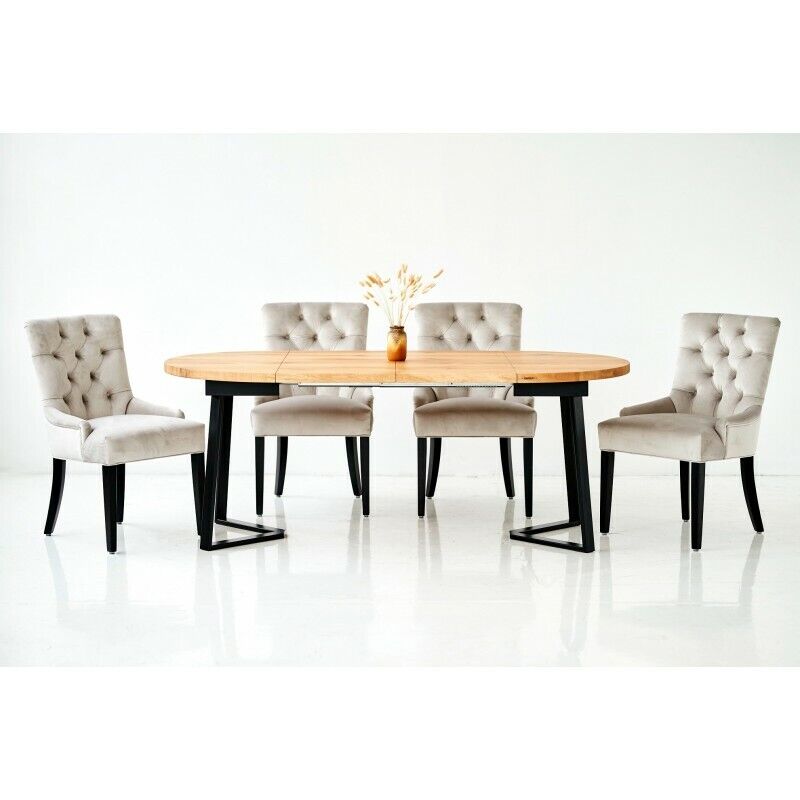 Jídelní stůl + 4 židle Chesterfield Stuhl židle dřevo sedák polstrovaná souprava představuje elegantní a praktický set pro vaši jídelnu nebo obývací pokoj. Stůl je dostupný v různých délkách a výškou 76 cm nabízí dostatek prostoru pro pohodlné stolování. Sada zahrnuje také čtyři židle s dřevěným rámem a polstrovaným sedákem, které kombinují tradiční design s moderním pohodlím. Textilní a dřevěný materiál použitý při výrobě poskytuje trvanlivost a eleganci, zatímco vnitřní konstrukce z pravého dřeva zajišťuje stabilní a pevnou konstrukci.