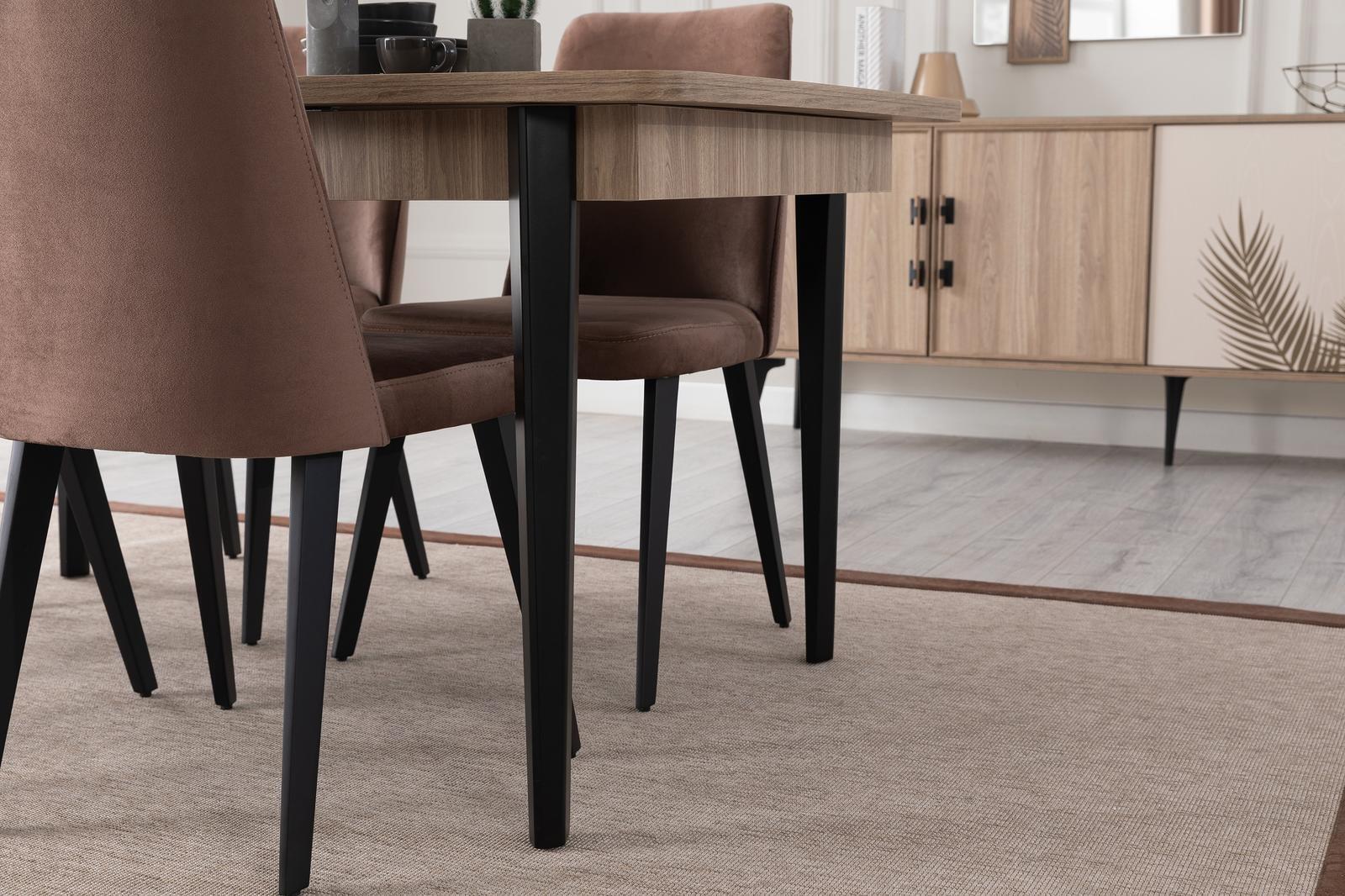 Využijte tuto jídelní sestavu nejen pro každodenní použití při rodinných večeřích, ale také jako stylový prvek vašeho interiéru. Jídelní stůl s židlemi poskytuje dostatek místa pro vaše hosty a rodinu a elegantní komoda nabízí praktický úložný prostor. Zrcadlo může opticky zvětšit váš prostor a dodat mu lehkost. Barevné provedení nábytku podtrhuje jeho luxusní vzhled a skvěle ladí s různými interiérovými styly. Tato sestava je skvělou volbou pro ty, kteří vyhledávají kvalitní a designový nábytek pro svůj domov.