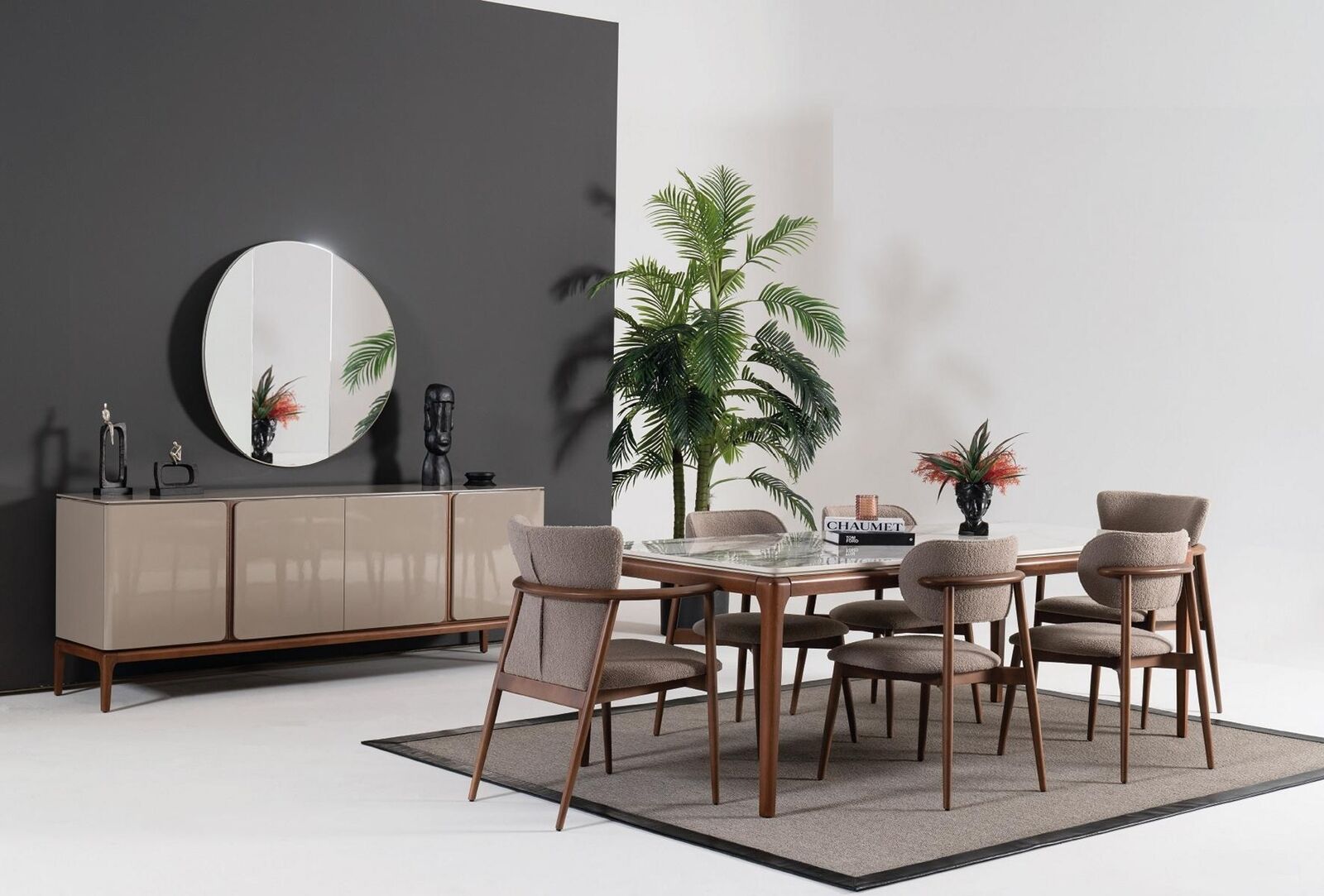 Díky své funkcionalitě a designu je tato jídelní sestava ideální volbou pro elegantní obědy i večírky. Barva je neutrální, což umožňuje snadné začlenění do různých designových stylů. Materiál kombinace dřeva, textilu a skla zajišťuje odolnost a dlouhou životnost produktů. Ve vašem domě se stane tato jídelní sestava nejen místem pro požitek z jídla, ale i centrem společenského života a setkávání s blízkými. Vytvořte si s ní jedinečnou atmosféru a užívejte si společné chvíle ve stylu a pohodlí.