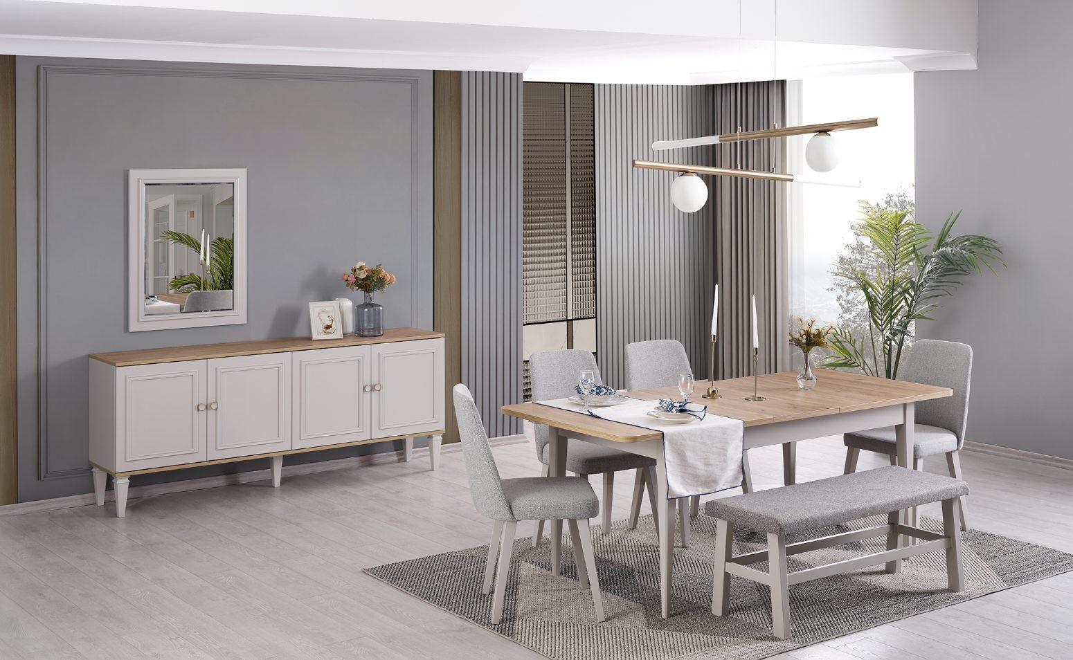 Využitím tohoto nábytkového setu můžete snadno vytvořit útulný a stylový jídelní prostor pro rodinné večeře nebo večírky s přáteli. Jídelní stůl s možností prodloužení je praktický pro hosty nebo pro rozšíření prostoru pro vaření. Komoda a zrcadlo dodají do vaší jídelny další úložný prostor a opticky ji zvětší. Díky kombinaci materiálů a barev bude tento nábytek skvěle ladit s ostatními prvky vašeho interiéru a vytvoří jedinečný a sofistikovaný vzhled vaší jídelny.