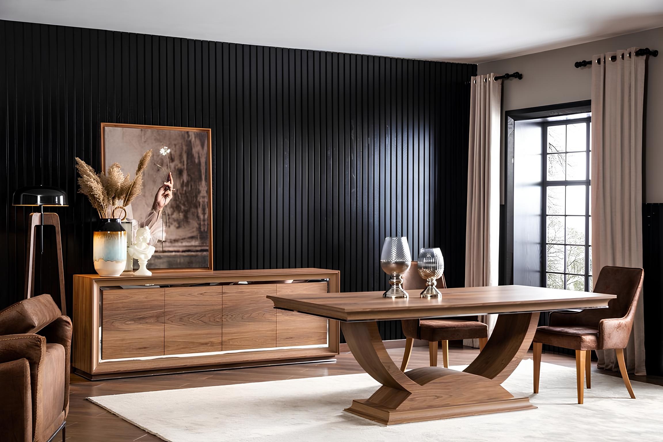 Jídelní stůl na sloupu elegantní představuje vrchol sofistikovaného designu a funkčnosti. Jeho hnědá povrchová úprava z kvalitního materiálu dodává interiéru nezaměnitelný nádech luxusu. Precizní zpracování a stylový sloup vytvářejí harmonickou rovnováhu mezi moderním a tradičním pojetím. Tento stůl je ideální volbou pro ty, kteří hledají nejen kus nábytku, ale i centrum společenského života. S jeho pomocí snadno vtisknete svému domovu exkluzivní atmosféru, která oslní každého hosta. Zvolte si tento stůl a prožijte každý okamžik ve společnosti blízkých v prostředí, které odráží váš vkus a životní styl.