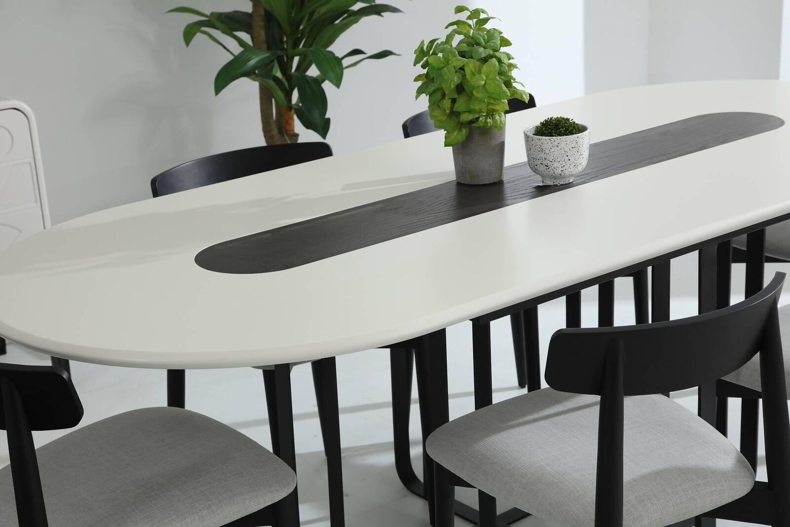 Tato jídelní skupina je skvělou volbou pro ty, kteří hledají spojení tradičního s moderním. Vzhledem k decentní barevné paletě, jak je znázorněno, ji lze snadno přizpůsobit různým stylům interiérů, přičemž jiné barevné varianty jsou k dispozici na vyžádání. Ideální pro větší rodinné večeře či oslavy, tato sada zajistí pohodlí pro všechny vaše hosty a zanechá trvalý dojem. Užívejte si kvality a funkčnosti, kterou tento jídelní set nabízí, a vneste do své domácnosti nádech elegance.
