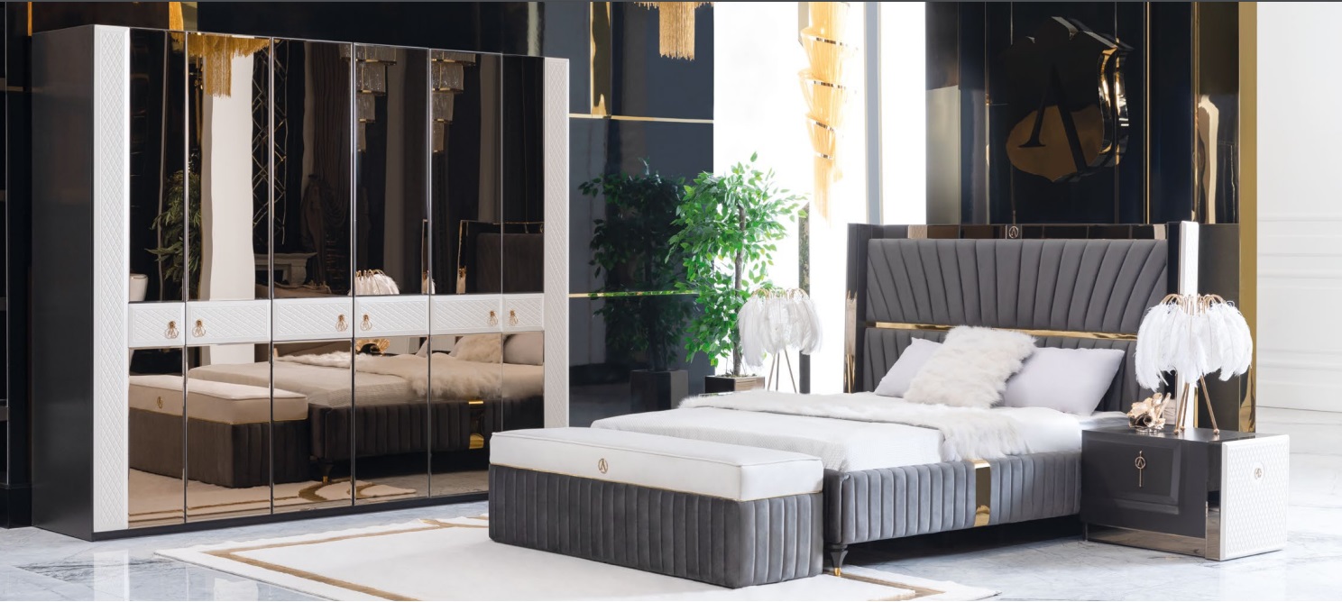 Ložnice Kompletní sada Postel Nocní stolek Nohátka 5dílná Design dřevo Nábytek Sady Nový je dokonalým doplňkem pro každou ložnici. Tato kompletní sada obsahuje postel s rozměry cca 223 x 204 x 137 cm a spacím prostorem cca 180 x 200 cm, 2x noční stolky s rozměry cca 70 x 49 x 54 cm, otoman s rozměry cca 132 x 40 x 44 cm a šatní skříň o rozměrech cca 266 x 70 x 215 cm. Materiál z pravého dřeva dodává tomuto nábytku elegantní vzhled a zároveň zaručuje jeho dlouhou životnost. Díky svému designu a kvalitním materiálům se tento nábytek skvěle hodí do moderních domovů.