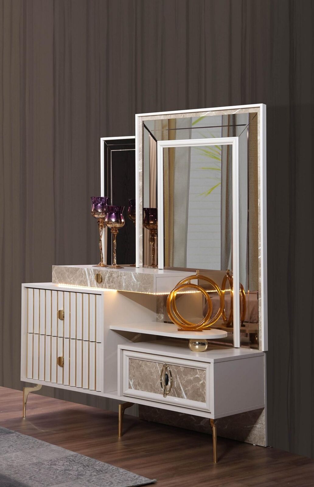 Tento moderní kompletní ložnice set je dokonalou kombinací elegance a funkčnosti. Designová postel s rozměry cca. 217 cm x 217 cm x 126 cm zajistí pohodlné spaní o rozměrech cca. 180 x 200 cm. K setu patří 2x noční stolky s rozměry cca. 65 x 44 x 63 cm, toaletní stolek se zrcadlem o rozměrech cca. 139 x 44 x 174 cm a prostorná skříň s rozměry cca. 260 x 60 x 218 cm. Všechny kusy jsou vyrobeny z kvalitního dřeva a doplněny moderním designem, který skvěle ladí s jakýmkoli zařízením ložnice.
