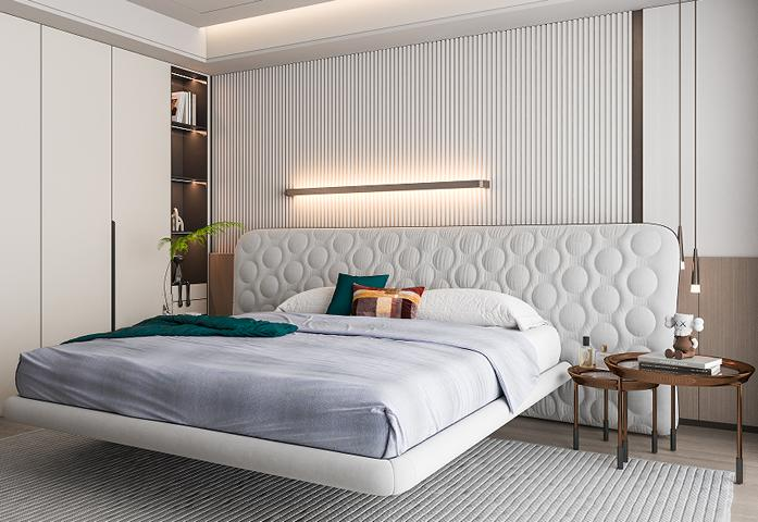 Moderní bílá čalouněná postel v minimalistickém kulatém designu