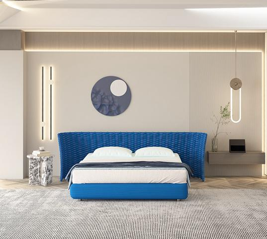 Nová modrá postel z látky s čalouněným čelem do ložnice