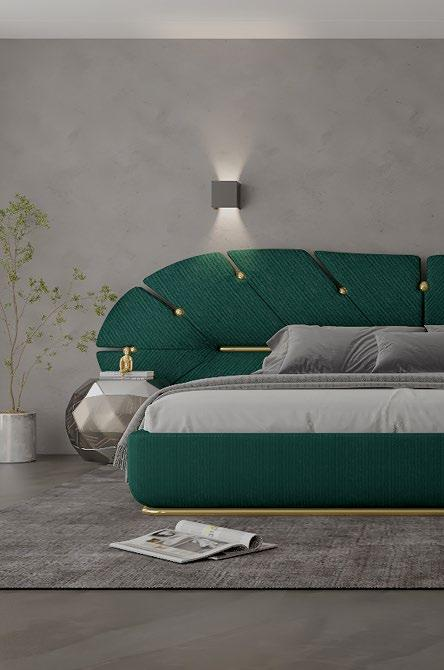Luxusní zelená postel se zlatými akcenty ve tvaru vějíře představuje dokonalou harmonii elegance a moderního designu, která pozvedne vaši ložnici na novou úroveň. Její jemná zelená textilie je nejen příjemná na dotek, ale také vnáší do interiéru pocit klidu a luxusu. Zlaté detaily dodávají posteli sofistikovaný nádech, čímž se stává skutečným středobodem prostoru. Tento exkluzivní kousek, vyrobený s precizností a péčí, je ideální volbou pro ty, kteří hledají jedinečné a stylové řešení pro svůj domov. S více než dvacetiletou tradicí v oblasti luxusního nábytku garantujeme, že tato postel uspokojí i ty nejnáročnější estetické požadavky.