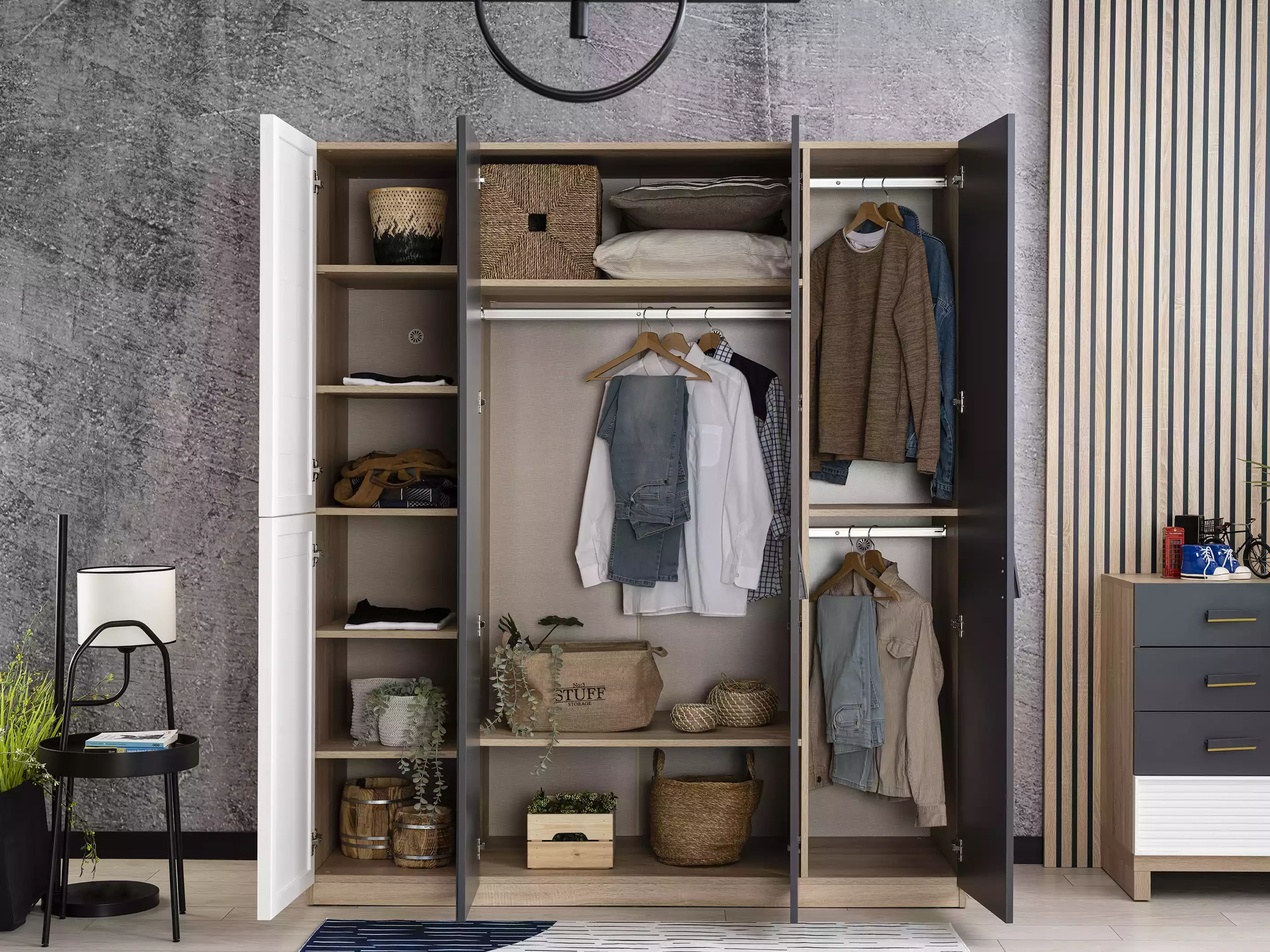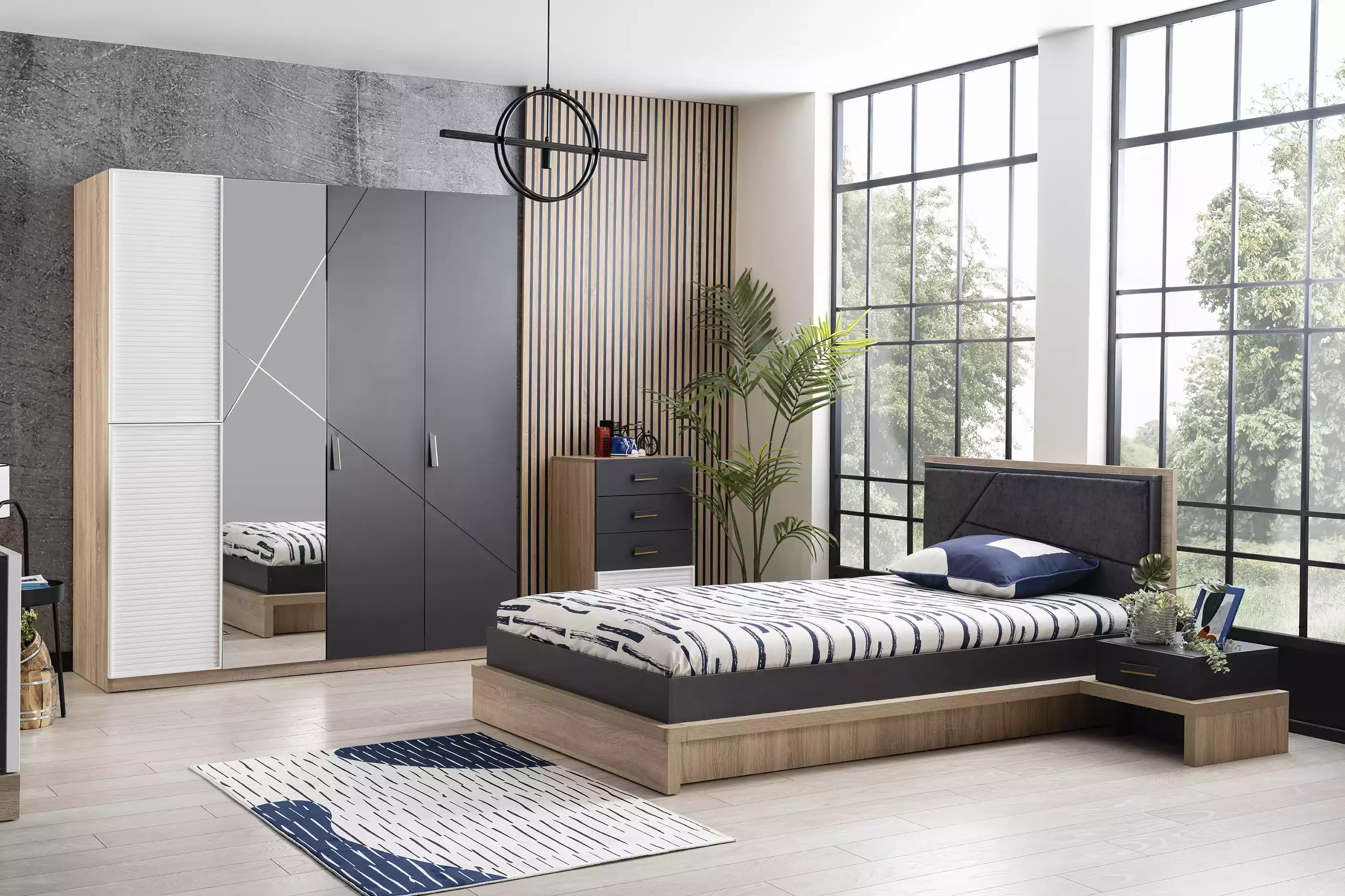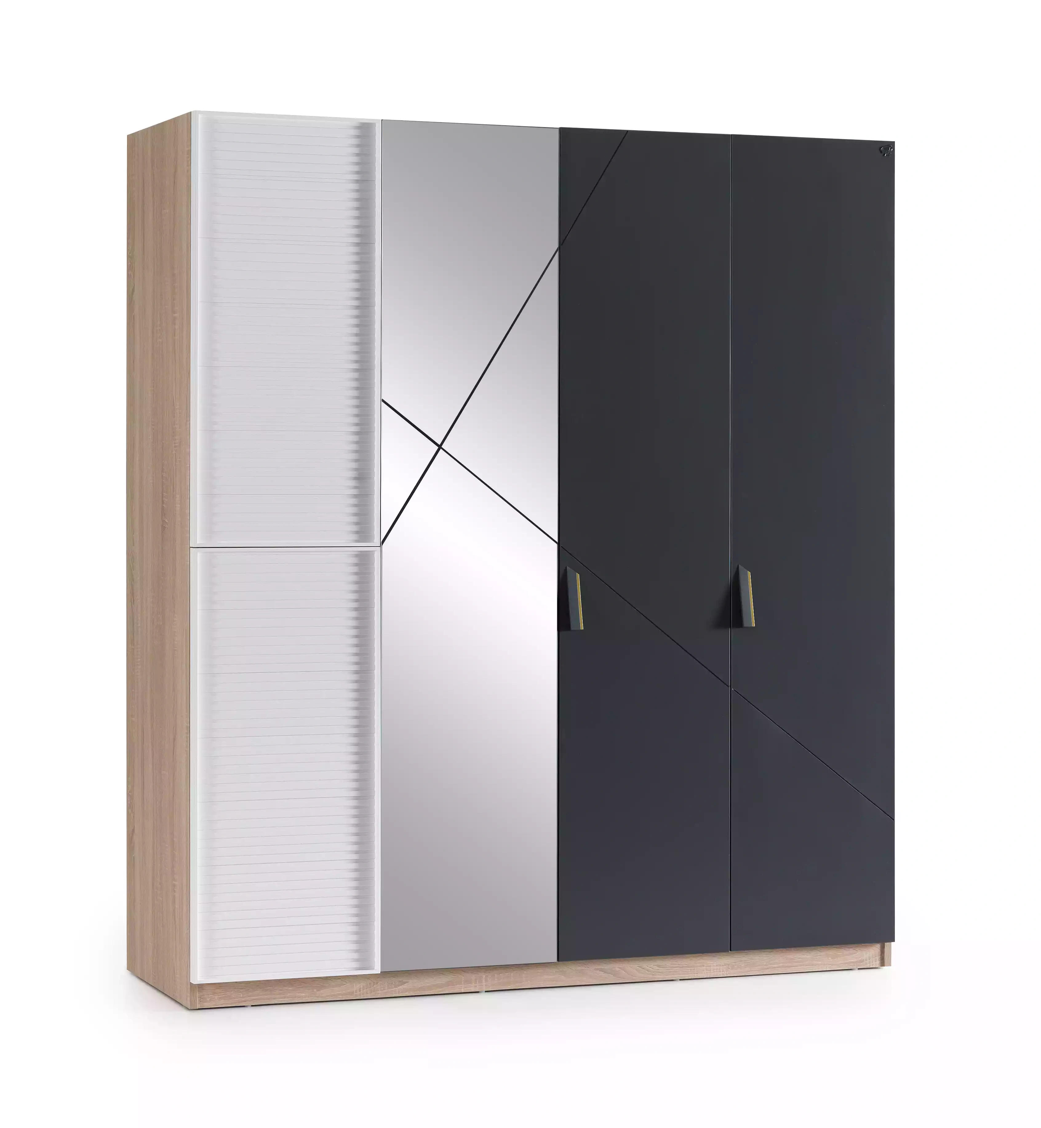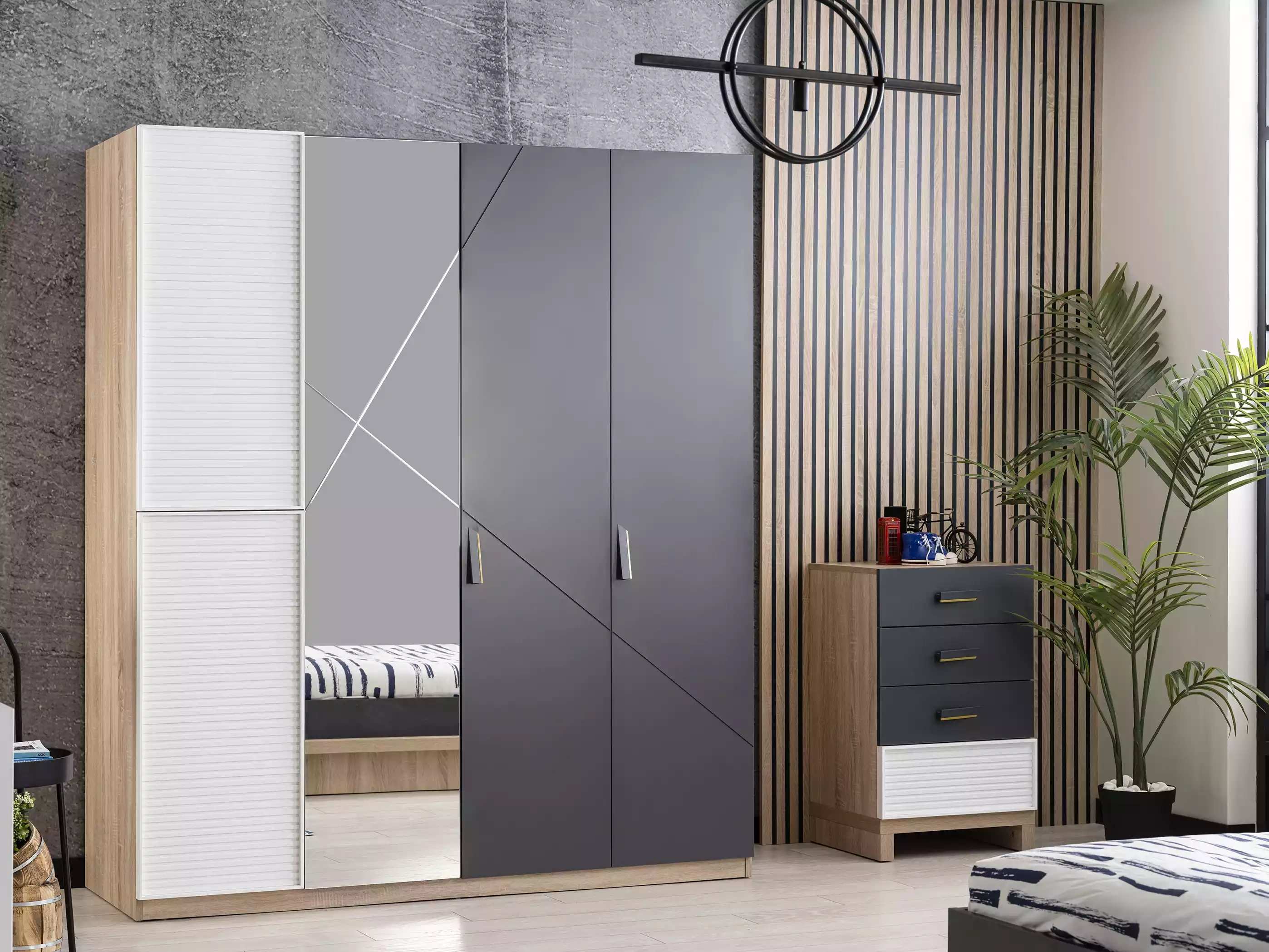 Skříň 4-dveřová Moden představuje dokonalou harmonii elegance a funkčnosti, ideální pro vytváření dětského pokoje s nádechem luxusu. Její rozměry 177 x 63 x 204 cm poskytují dostatek prostoru pro uskladnění veškerého oblečení a doplňků, zatímco šedá dřevěná konstrukce přináší do interiéru sofistikovaný vzhled. Zrcadlové dveře opticky zvětšují prostor a dodávají mu moderní nádech. Tento exkluzivní kus nábytku, navržený s důrazem na detail, je symbolem vysoce kvalitního bydlení, které podporuje životní styl zaměřený na eleganci a komfort. Skříň Moden je víc než jen nábytek; je to investice do budoucnosti vašeho domova.
