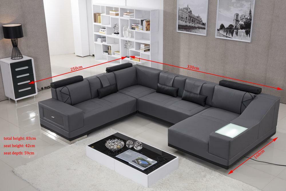 Tato kožená sedací souprava Big xxl U Forma je dokonalým doplňkem pro váš moderní domov. S jejím impozantním designem a luxusními materiály z prémiové kožené vlákna poskytuje nejen pohodlí, ale také eleganci a dekorativní prvek do vaší obývací části. S rozměry cca 160 x 330 x 250 cm nebo 250 x 330 x 160 cm a výškou 83 cm se postará o dostatek prostoru pro celou rodinu nebo hosty. Díky sedací ploše s hloubkou 90 cm a výškou sezení 42 cm si můžete vychutnat pohodlné posezení a relaxaci.