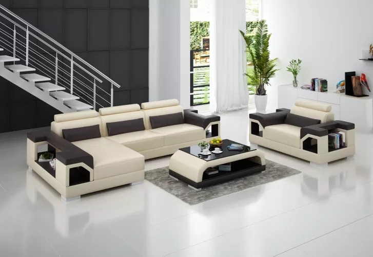 Ecksofa LForm Křeslo Konferenční stůl Moderní pohovka Kožená pohovka Ecksofa Čalouněný 4dílný set je luxusní a moderní sada nábytku, která okouzlí svým designem a funkcionalitou. Tento 4dílný set zahrnuje elegantní L-formovanou koženou pohovku, komfortní křeslo, stylový konferenční stůl a sofistikovaný ecksofa. Pohovka nabízí dostatek prostoru pro pohodlné sezení a odpočinek díky svým rozměrům a designu. Díky kvalitnímu materiálu z premium koženého faserstofu a vnitřnímu rámu z pravého dřeva poskytuje tento nábytek luxusní vzhled a dlouhou životnost.