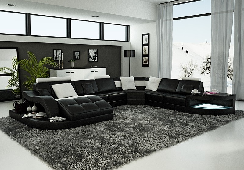 Obývací pokoj, rohová sedací souprava ve tvaru U, konferenční stolek