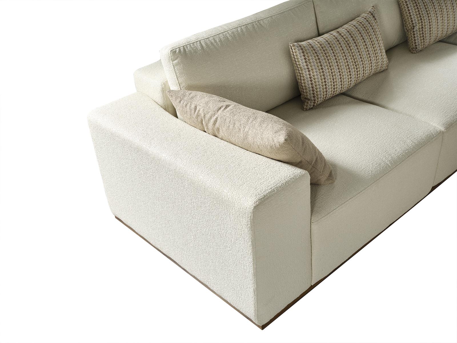 Bílá moderní rohová sedací souprava L tvaru je luxusní pohovka pro váš obývací pokoj. S rozměry přibližně 340 x 310 x 100 cm nabízí dostatek prostoru pro relaxaci a pohodlí. Tato pohovka je vyrobena z kvalitního dřeva a textilu, což zajišťuje její odolnost a dlouhou životnost. Výška pohovky přibližně 70 cm dodává elegantní vzhled a zároveň poskytuje pohodlné sezení pro celou rodinu. Barva této pohovky odpovídá modernímu designu, který se snadno hodí do různých interiérů.