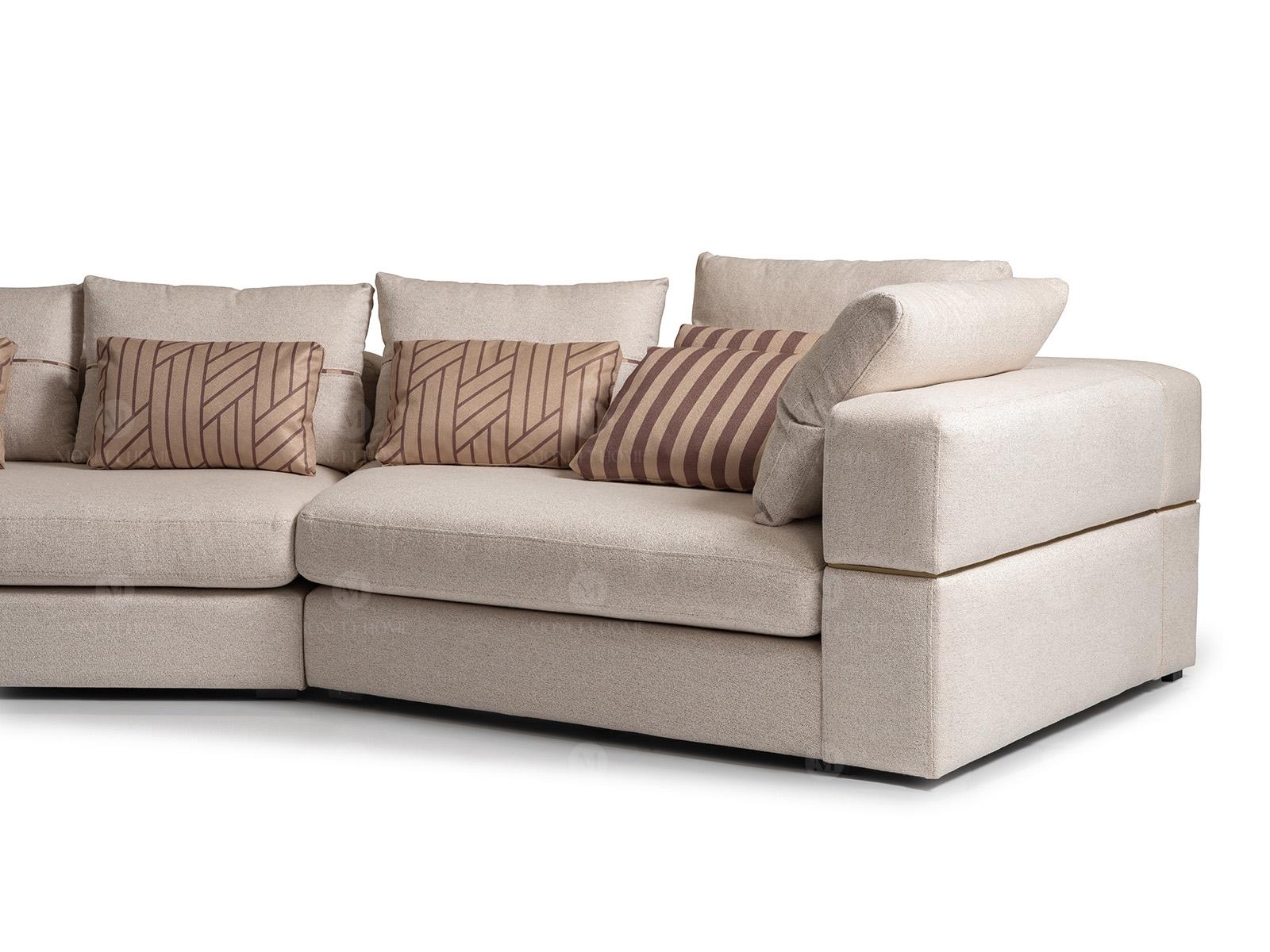 Sada sedacích souprav - rohová sedací souprava, křeslo, látková pohovka, mediální stolek RTV, béžová, moderní, 3 kusy.
