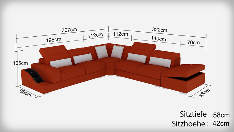 Kožená pohovka gauč obývací souprava rohová sedací souprava sedací souprava Moderní design je elegantní a moderní kousek nábytku pro váš obývací pokoj. S rozměry cca 307 x 322 cm nebo 322 x 307 cm nabízí dostatek prostoru pro odpočinek a relaxaci. Díky výšce cca 105 cm a hloubce cca 98 cm poskytuje pohodlné sezení a odpočinek. Vysoce kvalitní materiál z prémiových kožených vláken (70% kůže / 30% polyester) dodává pohovce luxusní vzhled a zaručuje dlouhou životnost.