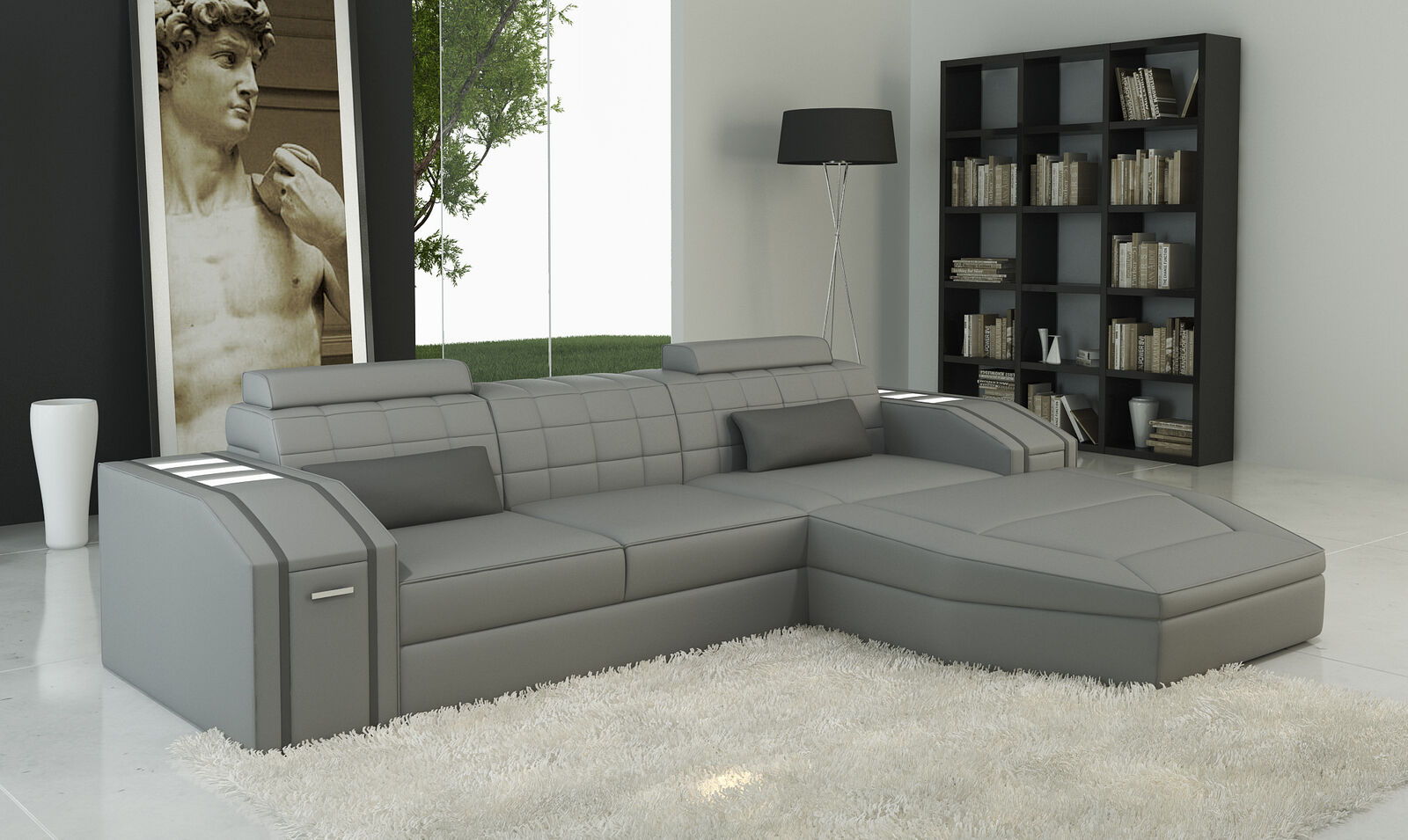 Osvětlená obývací místnost Pohovka z koženého povlaku Sedací souprava Rozkládací sedací souprava Velký je skvělým doplňkem pro váš obývací pokoj. Tato luxusní rohová pohovka ve tvaru L je vyrobena z prémiového koženkového materiálu a má moderní design, který jistě okouzlí každého návštěvníka. S rozměry cca. 332 x 227 cm nebo 227 x 332 cm, tato sedací souprava nabízí dostatek prostoru pro pohodlné posezení. Materiálem této pohovky je 70% kůže a 30% polyester, což zajišťuje příjemný pocit i dlouhou životnost.