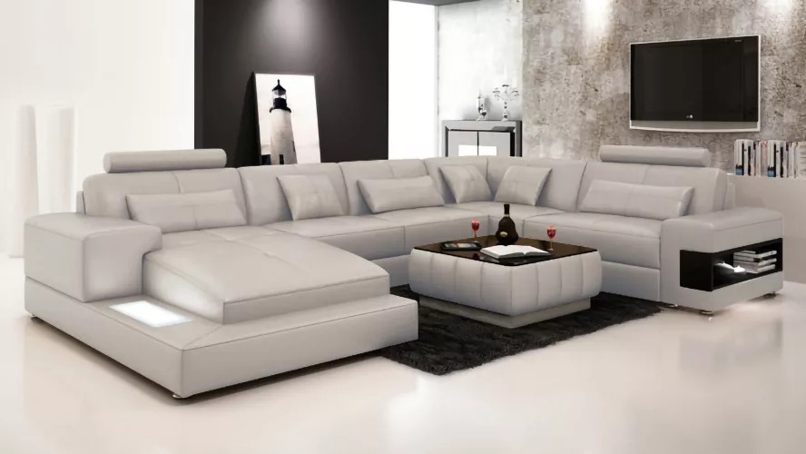 Kupte si rohovou sedačku v U-tvaru, levně, s kůží, pohovka do obývacího pokoje.