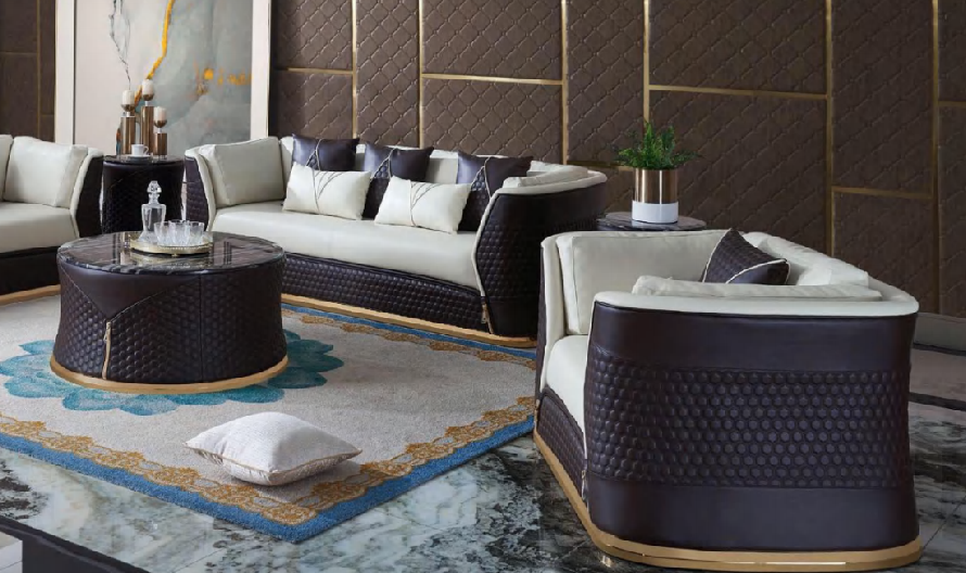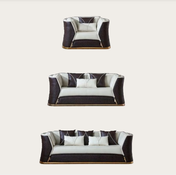 Garnitur 321 Sedací souprava 2x Konferenční stůl 2x Konferenční stolek Obývací souprava Sofa Pohovka 6dílná je luxusním a moderním doplňkem do Vaší obývací části. Tato sedací souprava obsahuje 3-místnou pohovku o rozměrech 230 x 105 x 81 cm, 2-místnou pohovku o rozměrech 190 x 105 x 81 cm a křeslo o rozměrech 129 x 105 x 81 cm. Materiály jako kůže, nerezová ocel a pravé dřevo zajišťují vysokou kvalitu a odolnost vybavení. Sedačky jsou navrženy tak, aby byly maximálně pohodlné s výškou sedu cca 42 cm a hloubkou sedu cca 64 cm.