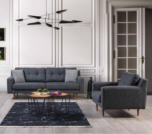 Obývací pokoj Šedá sedací souprava Luxusní polstrovaný nábytek Tkaninové pohovky Křesla je elegantním a pohodlným doplňkem do vašeho obývacího prostoru. Tato souprava obsahuje 3-místnou pohovku a křeslo, které nabízí dostatek prostoru pro odpočinek jak pro vás, tak vaše hosty. Luxusní polstrování zajišťuje pohodlí a relaxaci po dlouhém dni. S tkaninovým potahem a dřevěnými detaily se jedná o stylový kus nábytku, který zároveň poskytuje trvanlivost a kvalitu.