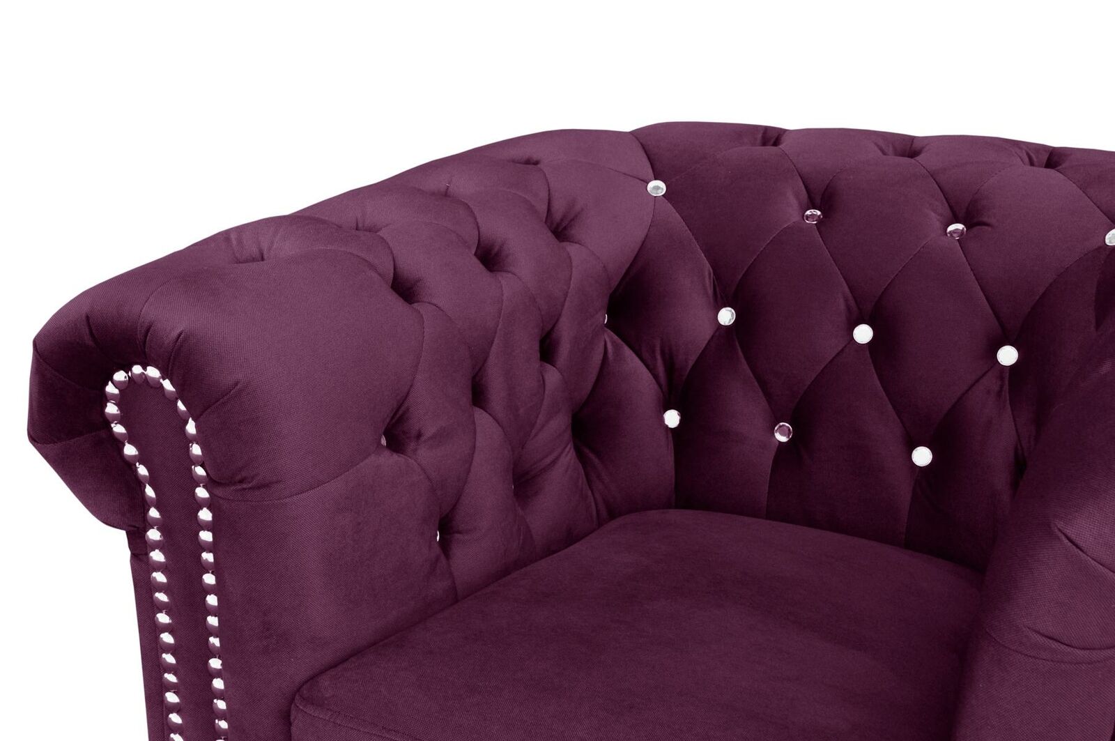 Chesterfield textilní pohovka s čalouněním 2místná lila lůžka pohovky pohovky z látky: Tato luxusní dvoumístná pohovka v lila barvě s čalouněním je elegantním a pohodlným kouskem pro vaše obývacího pokoje. S rozměry přibližně 148 x 86 x 72 cm nabízí dostatek prostoru pro relaxaci a odpočinek. Podsedák o hloubce 54 cm a výšce 50 cm poskytuje pohodlné posezení, zatímco echt dřevěné vnitřní rámy a pružinový podvozek zaručují stabilitu a dlouhou životnost.