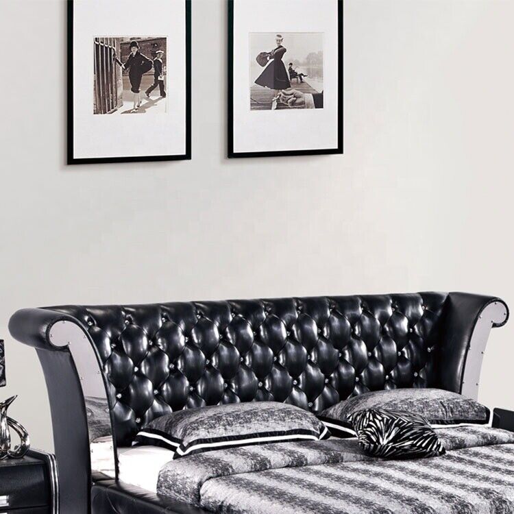 Nerezová ocel Luxus Chesterfield Kožená postel Dvojitá potahová postel Designer Postele Hotel je dokonalým spojením luxusu a elegance do vaší ložnice. Tato postel vám poskytne nejenom pohodlí během spánku, ale také se stane skvostným designovým prvkem vašeho interiéru. Vyberte si ze čtyř různých skupin materiálů pro potah - od prémiové umělé kůže po sametovou látku a dokonce i speciální látka odolná proti skvrnám. Díky možnosti přidání luxusních Swarovski krystalů na posteli se vaše ložnice stane opravdovým královstvím pohodlí.