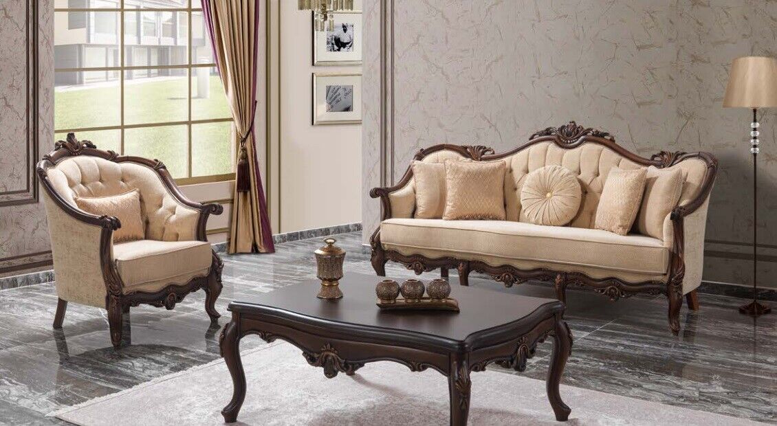 Polstrovaná sedačka Pohovka Sedací souprava Gauč Látěná pohovka Beige Chesterfield Set je elegantním a pohodlným doplňkem do vaší obývací části. Tato sedací souprava nabízí jednu třímístnou sedačku a jedno křeslo, obě vyrobené z kvalitního dřeva a textilu. Sedačka má rozměry cca. 235 x 100 x 115 cm a křeslo rozměry cca. 100 x 100 x 115 cm. Barevně laděná do příjemné béžové odstínu, tato sedací souprava dodá vašemu interiéru styl a eleganci, zatímco polstrování zajistí komfortní posezení.